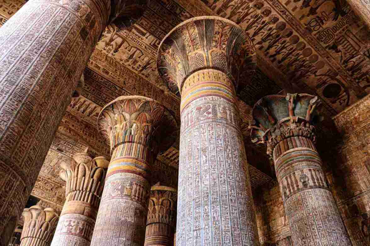 Die Decke der Hypostylhalle zeigt im Mittelgang zweireihig Geier mit ausgebreiteten Schwingen, seitlich eingefasst von Hieroglyphenbändern. Die Bildfelder beidseitig des Mittelgangs enthalten astronomische Szenen, so etwa die Tag- und Nachtfahrt der Sonne, die Mondphasen oder die sogenannten Dekansterne. Auch die Tierkreiszeichen sind abgebildet, dabei können noch heute bekannte Sternzeichen wie Skorpion, Widder oder Waage mit bloßem Auge ausgemacht werden.