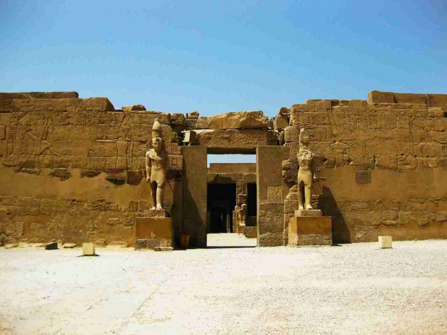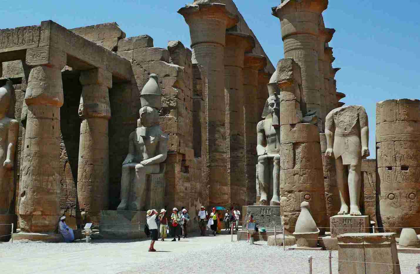 Ramses II. ließ den Tempel von Luxor um einen Hof und ein mächtiges Eingangstor, den Pylon, erweitern. Dessen zwei Türme sind je 24m hoch und weisen eine Breite von 65m auf. In jedem Turm befinden sich zwei hochrechteckige Aussparungen für Flaggenmasten.