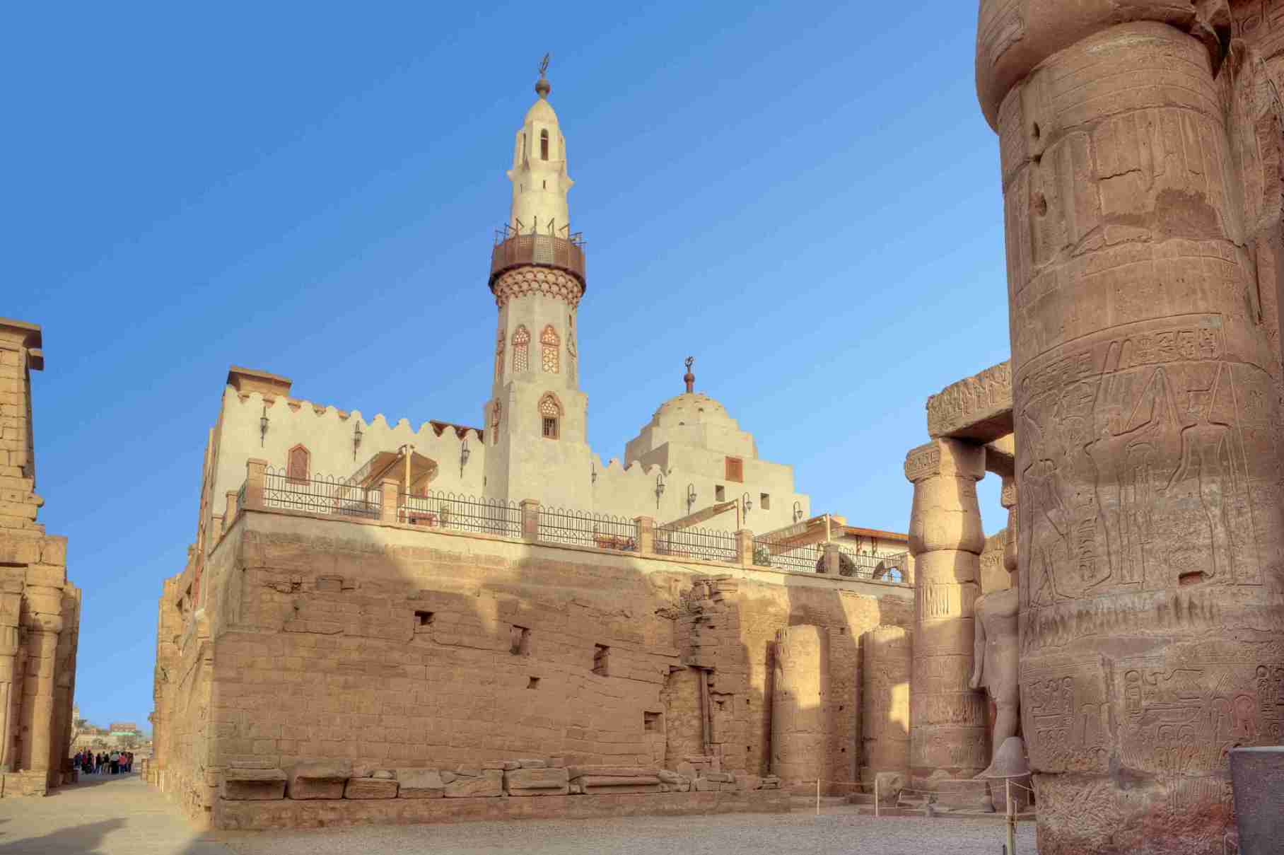 Zur Zeit der Fatimiden (969-1171) wurde auf dem Areal des Luxortempels, im Bereich des Hofes Ramses II., eine Moschee erbaut, sie beginnt wenig hinter dem Pylon und steht über der südöstlichen Umfassungsmauer des Hofes. Die Moschee ist dem Heiligen Yussuf Abu el-Haggag geweiht und entstand auf den Ruinen einer koptischen Kirche, zur Zeit der Erbauung war das Bodenniveau des altägyptischen Tempels bereits rund 5m hoch von Sandmassen verschüttet. Die Moschee beinhaltet eine dreischiffige Bethalle sowie das Grab von Abu el-Haggag. Sie verfügt heute über zwei Minarette: Das frühere ist aus ungebrannten Ziegeln erbaut und rund 30m hoch; bei einem Umbau im 20. Jh. wurde das moderne Minarett aus hellem Gestein hinzugefügt. Im Inneren des Gotteshauses haben sich Teile des ägyptischen Tempels in Form von Säulen und Architraven erhalten, was eine ungewöhnliche Mixtur ergibt; zudem bietet sich von der Moschee aus ein einzigartiger Blick auf den Luxortempel.
