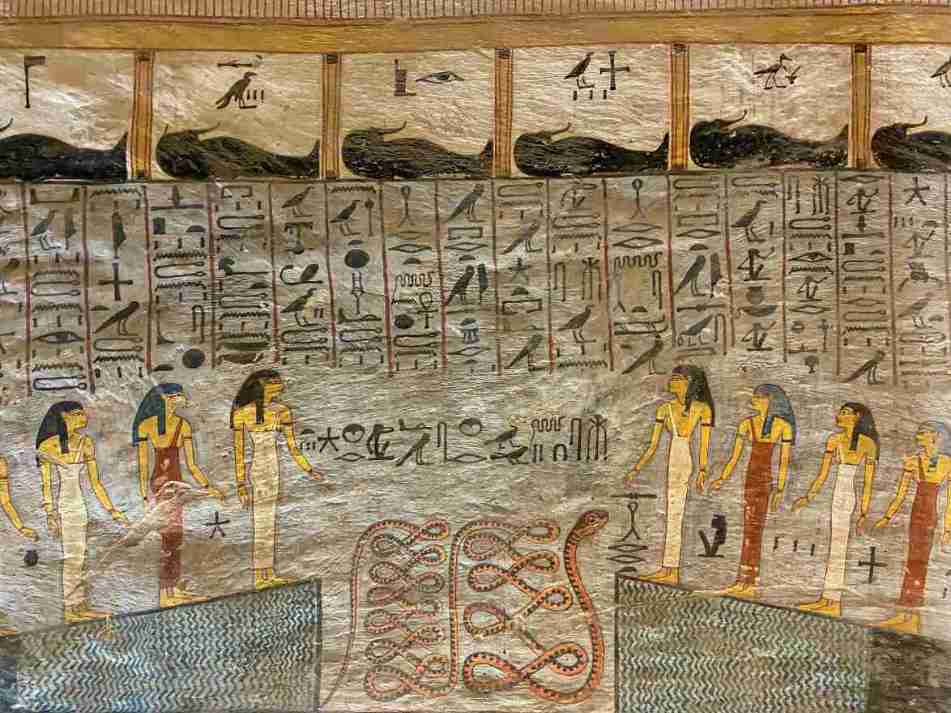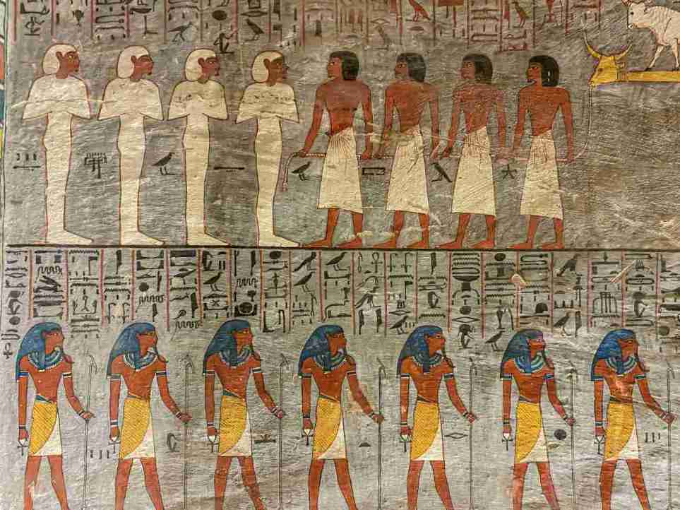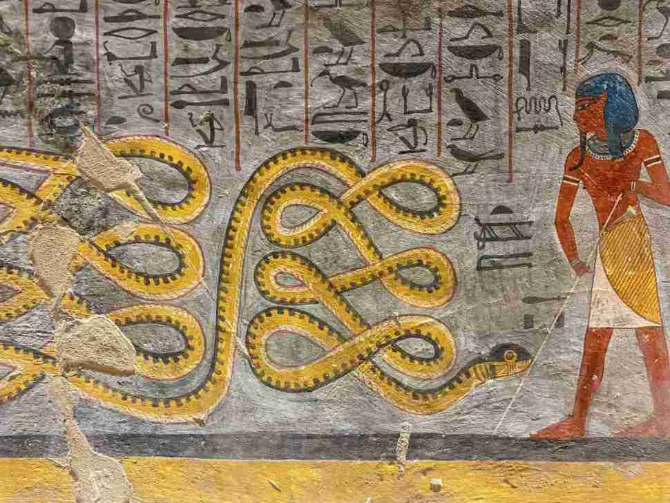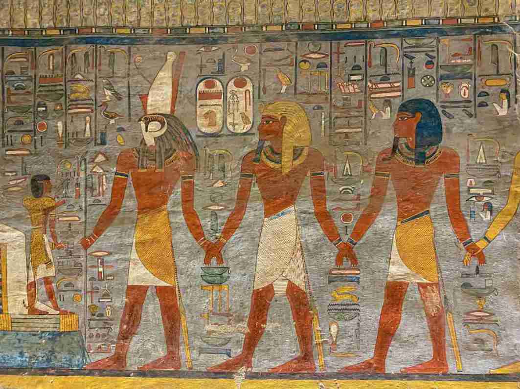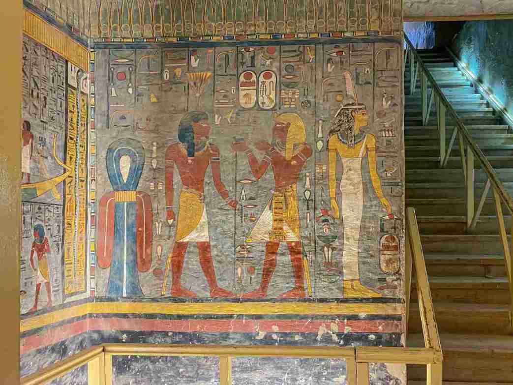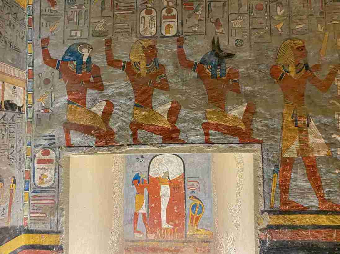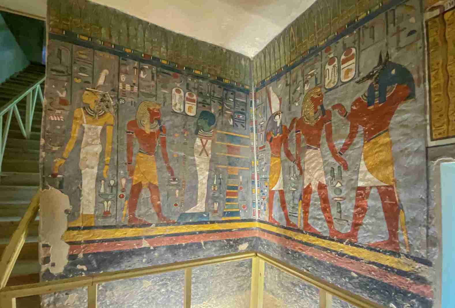 Die Rückwand der Grabkammer ist mit großen figürlichen Darstellungen bemalt, die den Pharao sowie diverse Gottheiten wiedergeben. Die Wandbemalung teilt sich in vier Bereiche auf: Die Figuren über und in der Nische Jb, den Pharao vor Chepri und in eine Szenerie, die den Herrscher im Geleit mehrerer Götter vor Osiris zeigt.