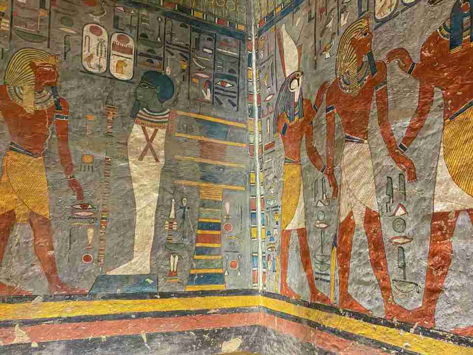 Die Wandbereiche neben der Eingangstür sind mit Szenen bemalt, die Ramses I. mit Gottheiten zeigen. Texte aus farbig aufwändig gestalteten Hieroglyphenzeichen erläutern die Szenen der Nordostwand. Bis auf wenige Bereiche, wo die Farbe aufgrund natürlicher Prozesse abgeblättert ist, sind die Darstellungen gut erhalten, was für die gesamte Grabkammer gilt.
