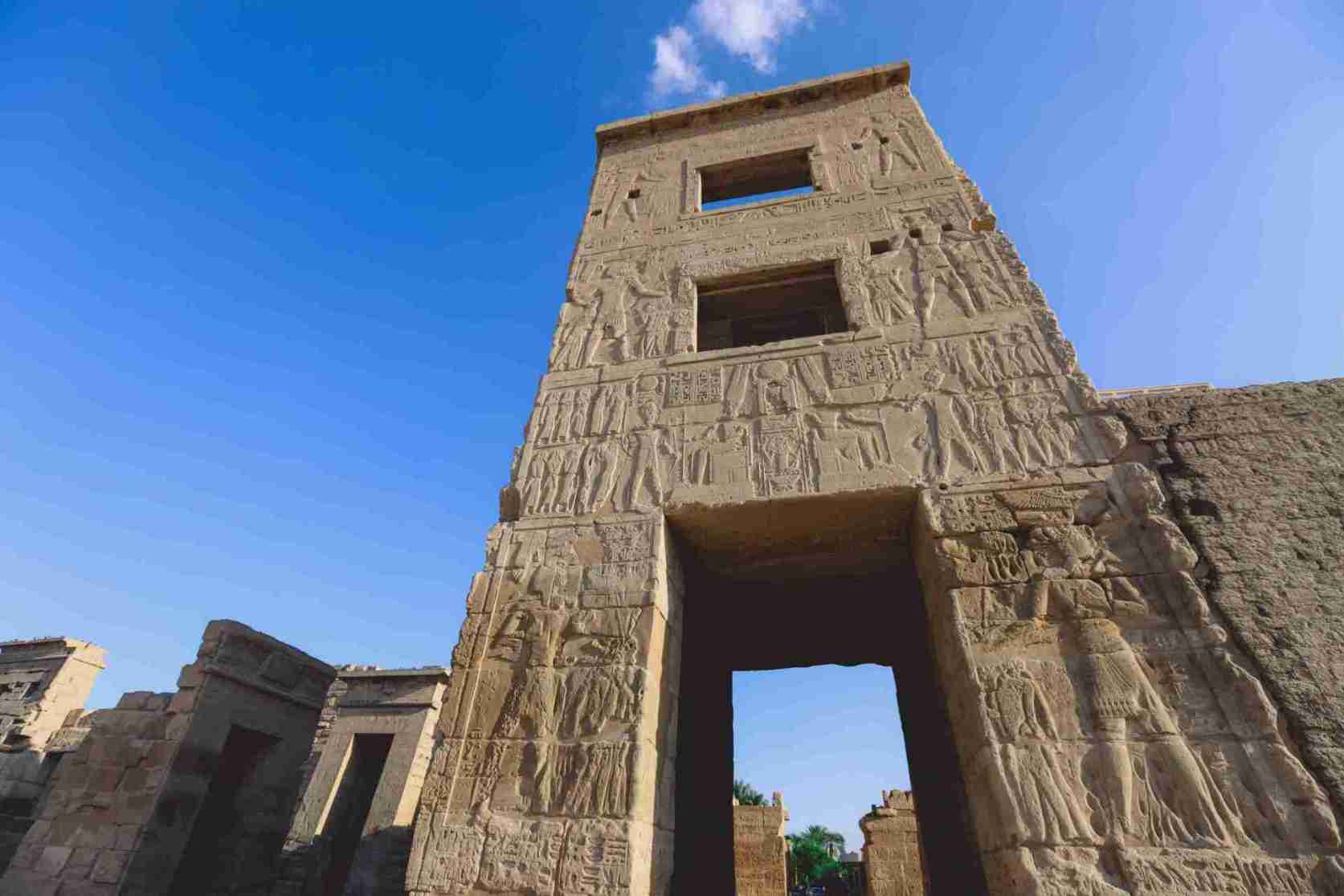 Der Hauptzugang zum Tempel erfolgte von Osten her. Er war über einen Kanal an den Nil angebunden und verfügte über eine Kaianlage. Ein kleines Tor in der Außenmauer, beidseitig von Wächterhäusern flankiert, bildet den Eingang zum Totentempel, gefolgt von einem imposanten, asiatisch inspiriertem, Torbau. Gegenüberliegend, an der Westseite des Totentempels, existierte ehemals ebenfalls eine großformatige Toranlage, von der aus die Wirtschaftsgebäude zugänglich waren. Dieses Tor ist jedoch nicht mehr erhalten.