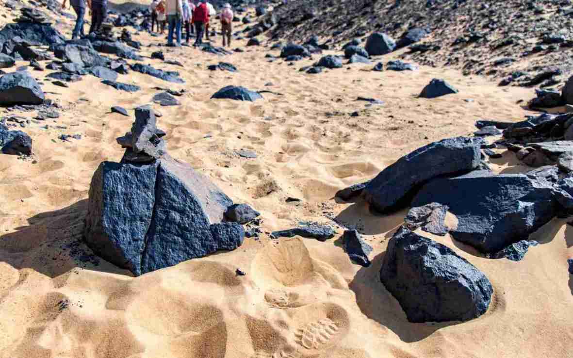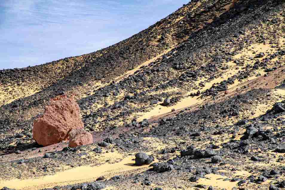 Die namensgebende Farbe der Schwarzen Wüste ist auf Vulkanausbrüche zurückzuführen, die mehr als 100 Millionen Jahre in der Vergangenheit stattgefunden haben. Die glühend heiße Lava verwandelt sich nach dem Abkühlen in schwarzes Vulkangestein, welches bis heute die Landschaft in diesem Teil der Sahara prägt. Im Laufe der Zeit hat sich das Gestein in feine schwarze Gesteinskörner verwandelt, die vergleichbar mit einer Staubschicht auf den Felsformationen sowie Teilen des orange-gelben Wüstensandes ruhen.