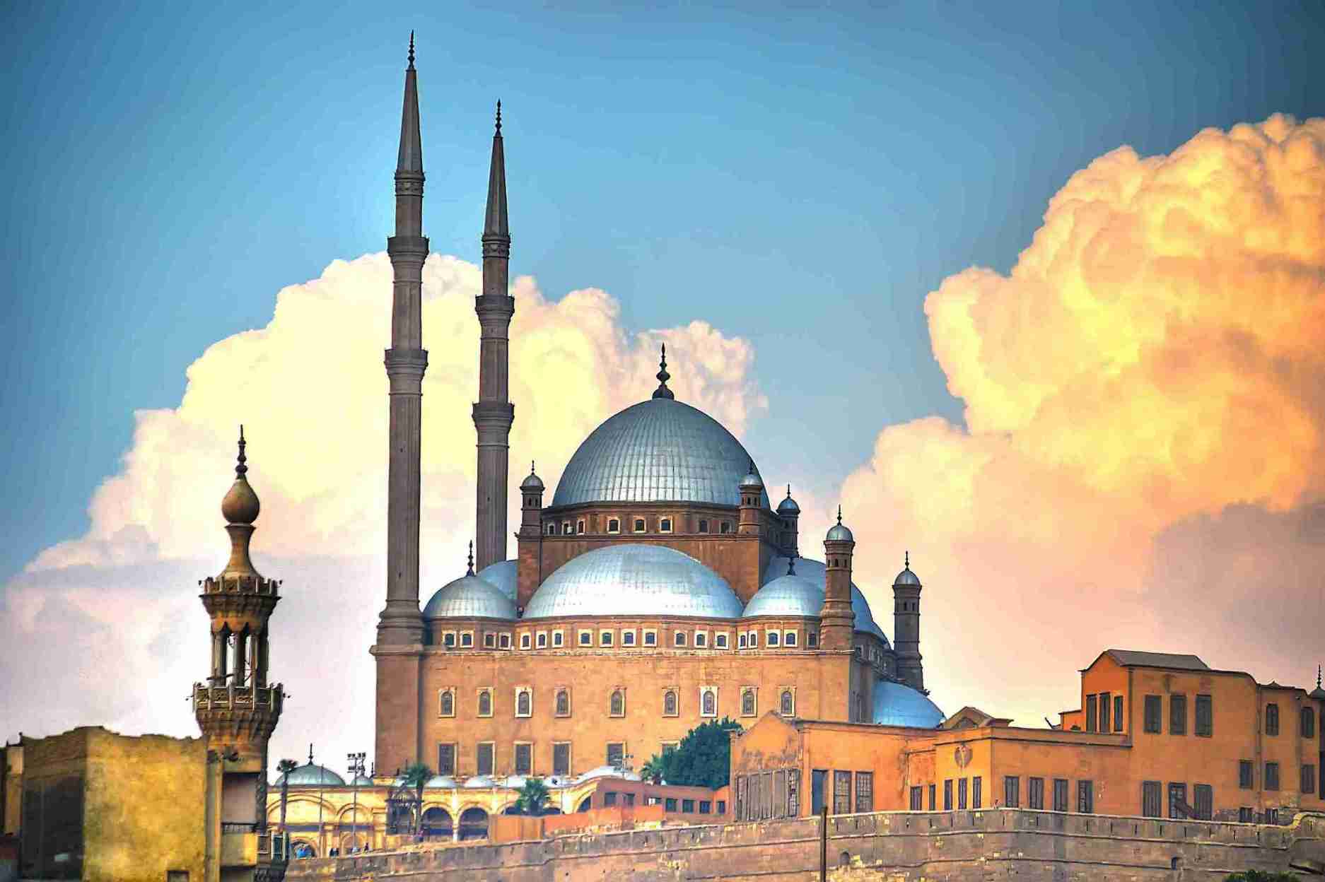 Eines der Wahrzeichen Kairos, das prominent am höchsten Punkt der Zitadelle errichtet wurde, ist die Alabastermoschee. Dieses Bauwerk wurde 1830-1857 auf Anweisung Muhammad Ali Paschas errichtet, sein türkischer Baumeister gestaltete die Moschee nach osmanischen Vorbildern. Ihr prägnantestes Merkmal ist die riesige Kuppel der Gebetshalle (von 21m Durchmesser), die von weiteren Kuppeln und Halbkuppeln eingefasst wird und reich verziert ist. Die Moschee hat zwei schlanke Minarette, die ca. 82m in die Höhe ragen. Der offene Hof wird von bogenüberspannten Arkaden eingefasst, der Brunnen für rituelle Waschungen befindet sich zentral darauf, er ist opulent ausgeführt. Alabaster, das Gestein, welches dem Bauwerk seinen Rufnamen gegeben hat, wurde verschwenderisch eingesetzt, beispielsweise in Form von meterhoher Wandverkleidung. Im Inneren der Moschee befindet sich das Grab Ihres Gründers, Muhammad Ali, sein Prunksarkophag ist aus hellem Marmor gefertigt.