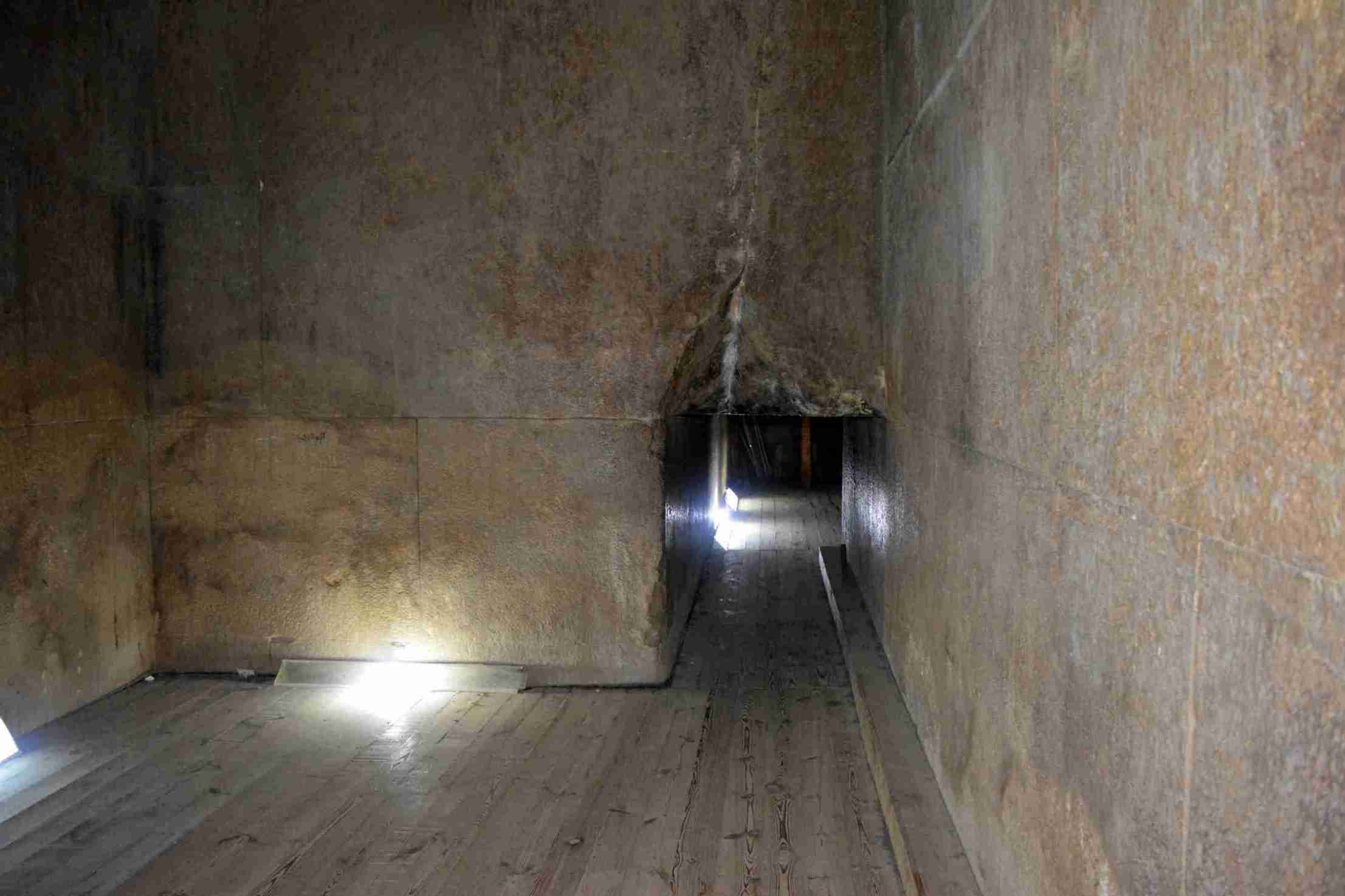 Das Innere der Pyramide ist über einen absteigenden Gang zugänglich, der an der Nordseite der Pyramide in 28m Höhe beginnt. Diese Passage von lediglich 0,91m Höhe und 1,23m Breite führt bis auf Bodenniveau. Am Ende der Passage liegt ein kleiner Schacht, der wohl zur Aufnahme von Regenwasser dient. Das letzte kurze Teilstück des Ganges führt horizontal auf die erste Vorkammer zu. Auffällig ist, dass es keinerlei Sperrsysteme gibt, wie dies etwa bei der Knickpyramide der Fall ist. Ein weiterer Unterschied zu deren Innenbauten besteht darin, dass keine unterirdischen Anlagen existieren, sämtliche Kammern und Gänge befinden sich auf Bodenniveau oder höher. Dafür werden zwei Erklärungen angeführt: Zum einen könnte diese Bauweise die Stabilität des Baugrundes weniger gefährdet haben und zum anderen könnte der Bezug des Pharaos zum falkengestaltigen Gott Horus und zur Sonne zu einer erhöhten Anlage der Pyramidenkammern geführt haben. Diese Bauweise wurde noch bis zu den Innenbauten der Cheops-Pyramide angewendet.