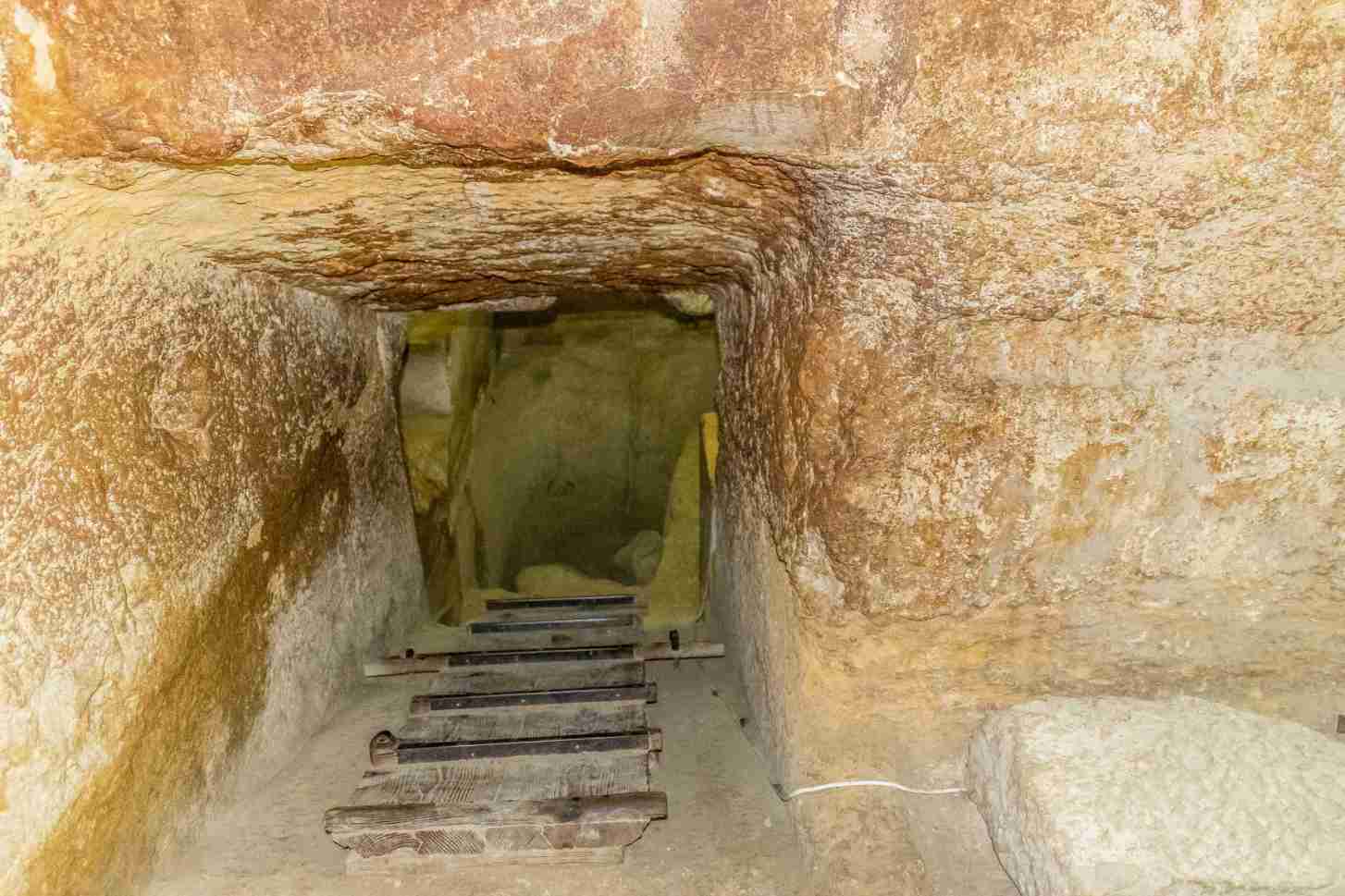Vom ursprünglichen Eingang aus führt ein absteigender Gang von 1,1m x 1,2m über eine Länge von 28,2m auf die aufsteigende Passage. Von diesem Knotenpunkt aus gelangte man, dem absteigenden Gang weiter folgend, nach ca. 30m in eine unterirdische Kammer, die im Felskern der Pyramide liegt. Die Kammer ist unvollendet geblieben, vollständig ausgeführt hätte sie 14,0x7,2m² Grundfläche bei einer Höhe von 5,3m gemessen. Von ihrer südöstlichen Ecke geht ein schmaler Gang Richtung Süden ab, wozu dieser diente (und ob er tatsächlich zur Zeit der Erbauung entstand oder nachträglich von Grabräubern geschaffen wurde) ist unklar. Auch die Deutung der Kammer selbst ist ungewiss, sie mag Bezüge zur Unterwelt und der ägyptischen Gottheit Sokar herstellen. Ein unregelmäßiger, enger Schacht (0,66m x 0,68m) verbindet den absteigenden Korridor mit der großen Galerie. Seine Funktion ist unbekannt, daher trägt er Bezeichnungen wie „Brunnenschacht“, „Grabräuberschacht“ oder „Luftschacht“, je nachdem welche ursprüngliche Nutzung angenommen wird.