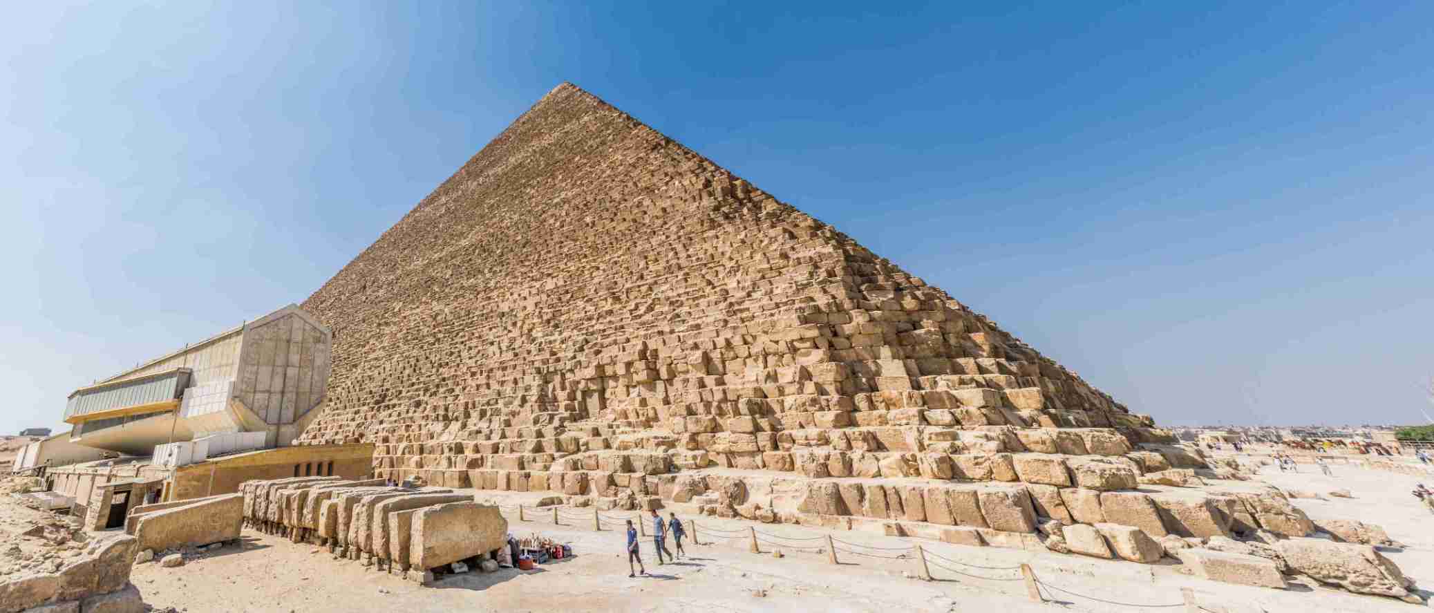 Die Pyramiden des Gizeh-Plateaus sind das einzige noch existierende der 7 antiken Weltwunder und Weltkulturerbestätte. Die Pyramide des Cheops ist die größte Pyramide unter diesen und die größte Ägyptens überhaupt. Der gigantische Grabbau bestand ursprünglich aus etwa 2,5 Mio.m³ Gestein bei einer Grundfläche von 230,4m² war er ehemals 146,6m hoch (heute noch 138,8m) mit einer Neigung von 51°. Als erster unter den Königen der 4. Dynastie wählte Cheops das Felsplateau von Gizeh als Standort für seinen Grabkomplex, wo sich bis dato lediglich Mastabagräber aus der Zeit der 1.–3. Dynastie befanden. Das Plateau war wegen des felsigen, stabilen Untergrunds und nahegelegener Steinvorkommen perfekt geeignet für den Bau eines weitläufigen Pyramidenkomplexes. Das lokale Gestein diente als Baumaterial in Form der Steinblöcke, die den Kern der Pyramide bilden, während hochwertiger Granit aus Assuan (für die Innenbauten) und feines Kalkgestein aus Tura (für die äußere Verkleidung) auf dem Nil zum Bauplatz befördert wurden. Als Basis der Pyramide diente ein natürlicher Felskern, um den herum der Boden eingeebnet und mit einer Basis aus Tura-Kalkstein versehen wurde, wobei die Ausrichtung der Pyramide mit hoher Präzision exakt nach den vier Himmelsrichtungen erfolgte. Die bis zu 3t schweren Blöcke, welche für den Kern des Bauwerks verwendet wurden, sind mittels Mörtel in wohl 210 Stufen übereinander angeordnet worden, von denen heute noch 203 erhalten sind. Die obersten Lagen sowie der Abschlussstein, das Pyramidion, fehlen. Die Verkleidung der Pyramide aus hellem, feinem Kalkstein fiel beinahe gänzlich dem Steinraub zum Opfer, lediglich in der untersten Lage finden sich wenige Reste davon.