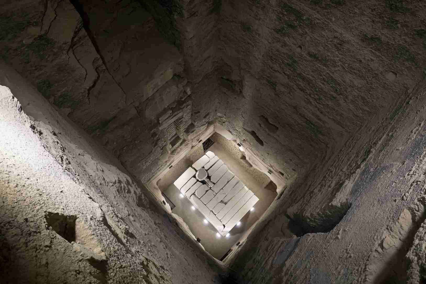 Der zentrale, senkrecht nach unten führende Schacht weist exakt die gleichen Maße auf wie der unter der Pyramide: 7m im Quadrat und 28m Tiefe. Der „Manövrierraum“ (von dort aus konnte die Grabkammer verschlossen werden) oberhalb der Grabkammer bestand aus Kalksteinplatten, die Decke imitierte Palmholzstämme. Kalksteinblöcke mit Sternenrelief fanden sich in diesem Raum. Durch eine runde, mit einem Granitpropfen verschlossene Aussparung im Boden gelangte man in eine Kammer aus Rosengranit. Ihre Lage definiert sie als Grabkammer, das geringe Ausmaß von 1,60m im Quadrat hätte jedoch die Bestattung eines Erwachsenen nicht erlaubt. Die Deutungen der Kammer sind vielfältig, sie reichen von einem Raum für die Kanopen, über eine Wohnstätte des ka bis hin zur Begräbnisstätte der Kronen.